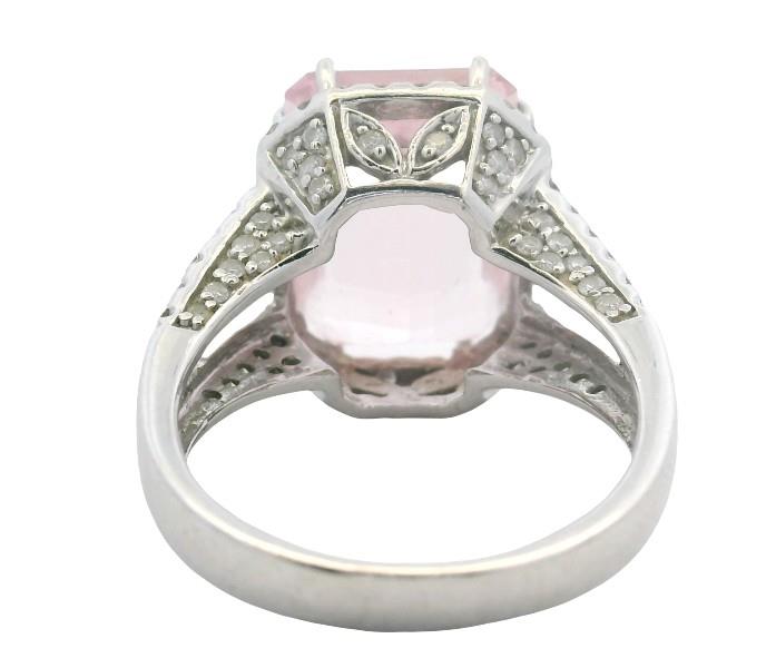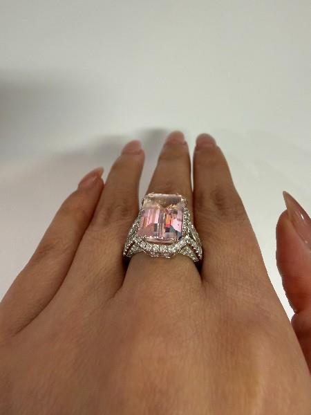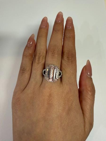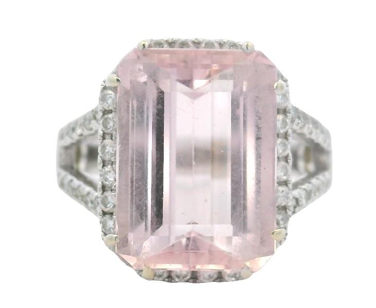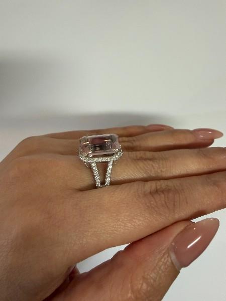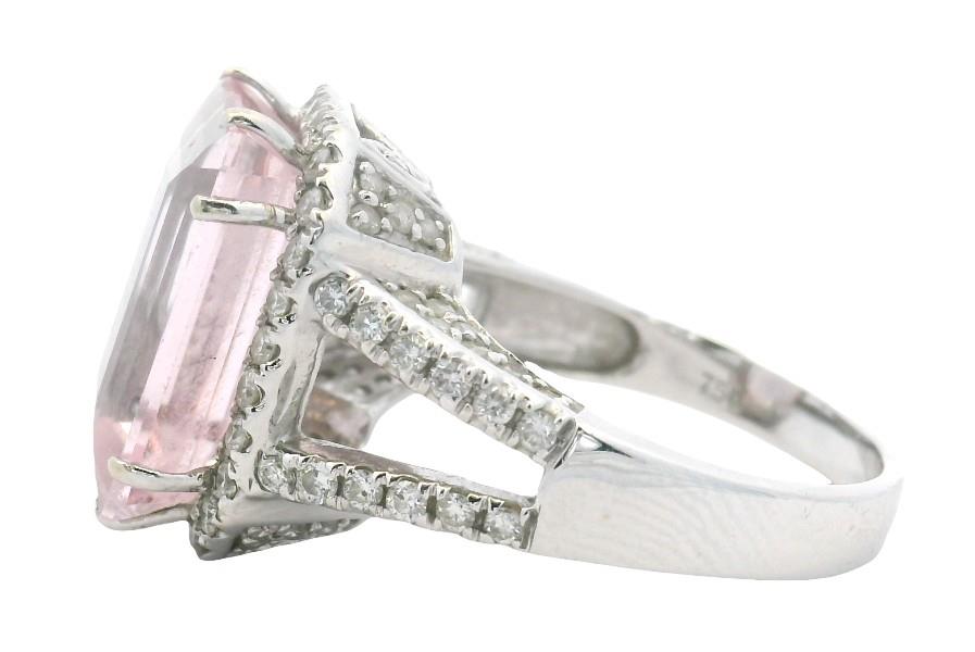 18ct white gold, stamped, featuring an emerald cut morganite of approximately 5.50ct, medium to light pink tones, double claw set, surrounded by a cluster of round brilliant cut diamonds, extending to the wide split shoulders, and to the decorative underbridge, merging into a polished square edge band. Ring size: N. Total Weight: 8.0g