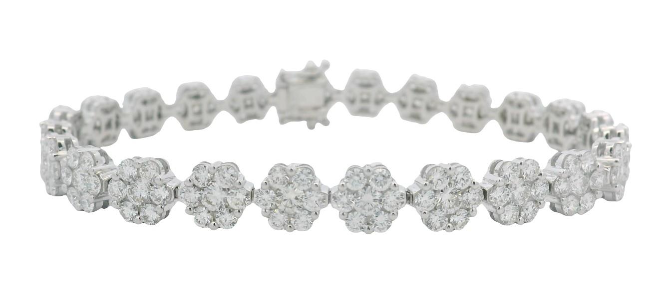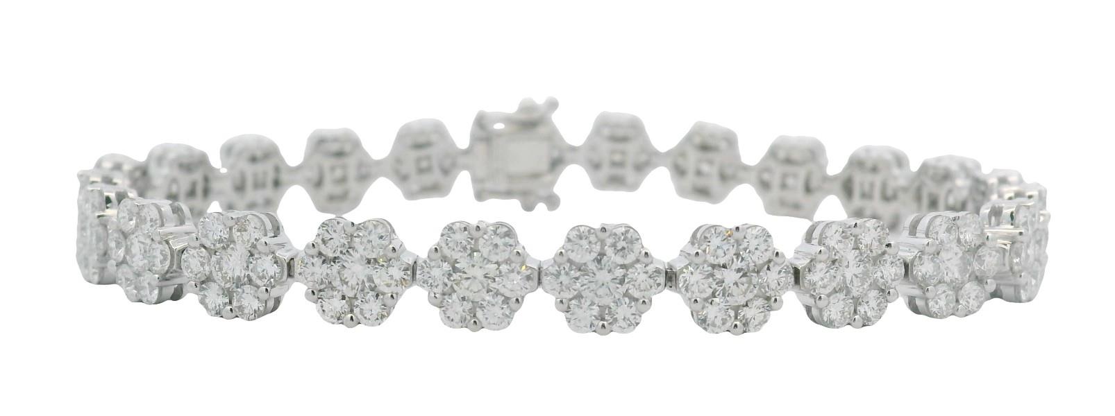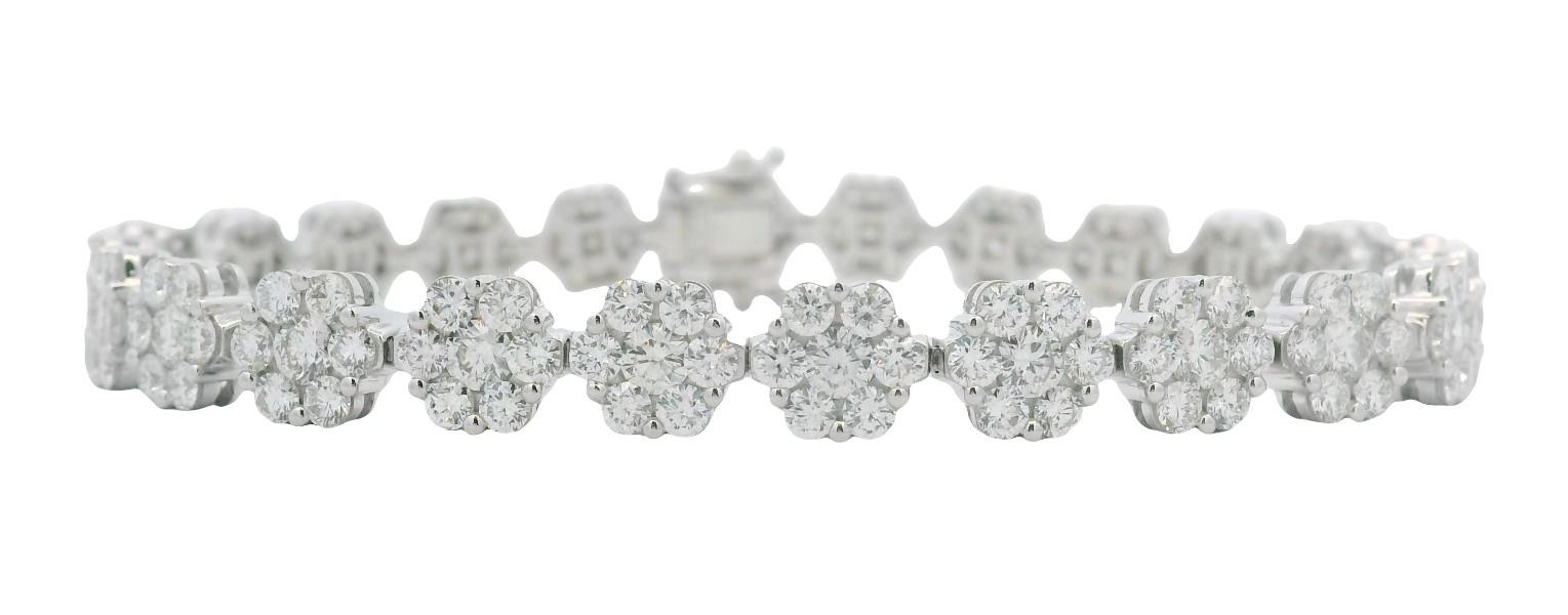 18ct white gold, featuring twenty-four round floral clusters of seven round brilliant cut diamonds, totalling 7.78ct, of almost uniform sizes, shared bead set, individual basket setting, double rail, linked through the middle in a semi flexible bracelet measuring 18cm long, complete with concealed groove and tongue clasp, secure with double side latches. Total Weight: 18.6g. Valuation on request.