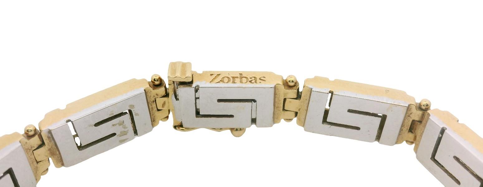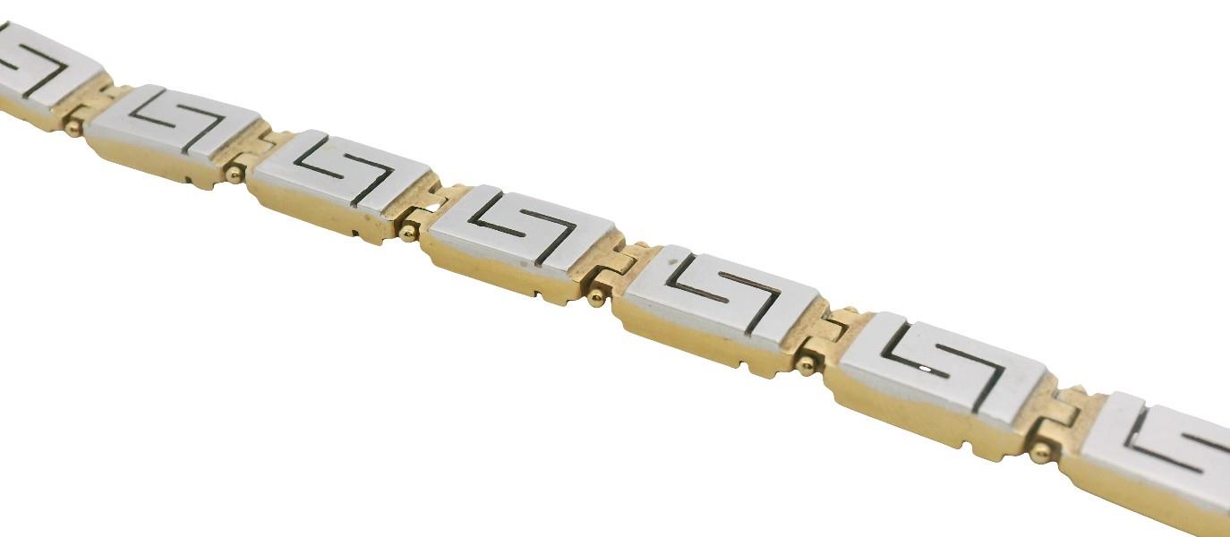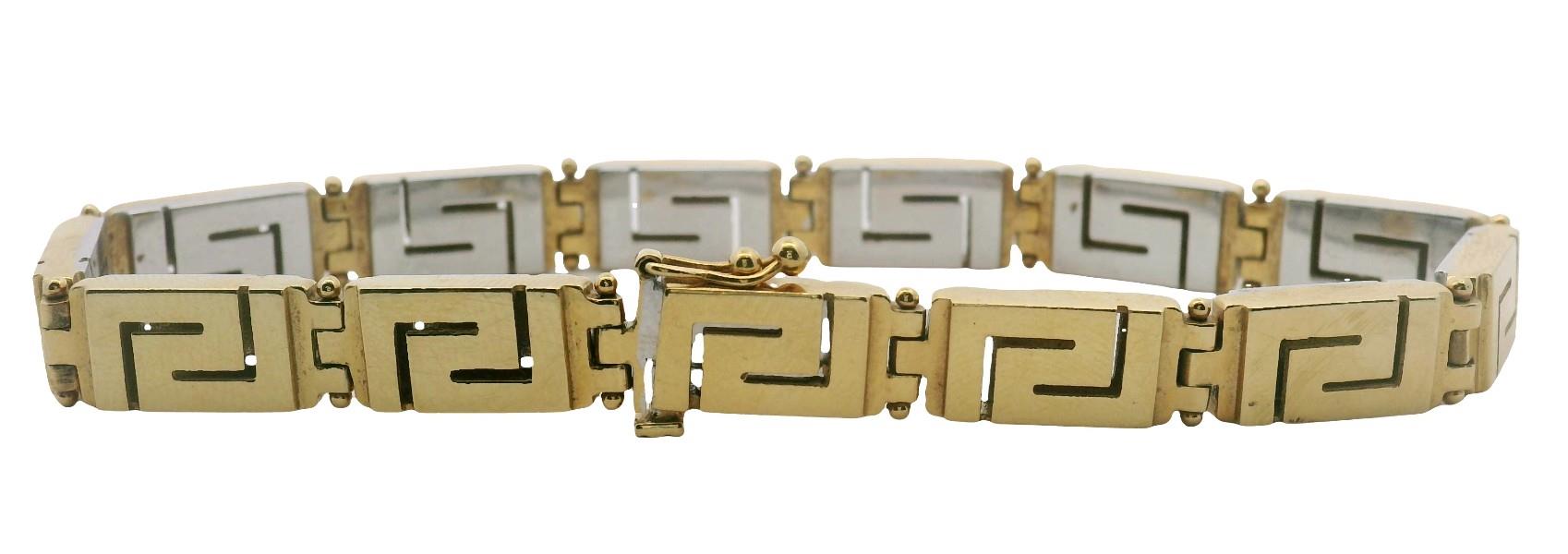 AN 18CT YELLOW AND WHITE GOLD DIAMOND DETAILED GRECIAN KEY PATTERN BRACELET, 23.2GR