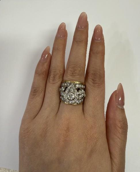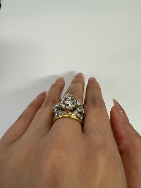 18ct white & yellow gold, handcrafted by Vears Jewellery Mornington, designed as a modern three row panel band ring, featuring raised pear shaped centre plate, grain set by one 0.50ct brilliant round diamond, & another smaller diamond creating a pear shaped illusion, detailed by a halo of 16 brilliant cut diamonds, flanked by leaf plates with grain & bezel set diamonds, further framed by rows of diamonds, claw set in white gold, totalling approx 1.90ct, completed with pierced scrollwork. A.T.D.W: 1.90ct. Custom by Vears. Ring Size M1/2. Valuation. TW: 18.5grams