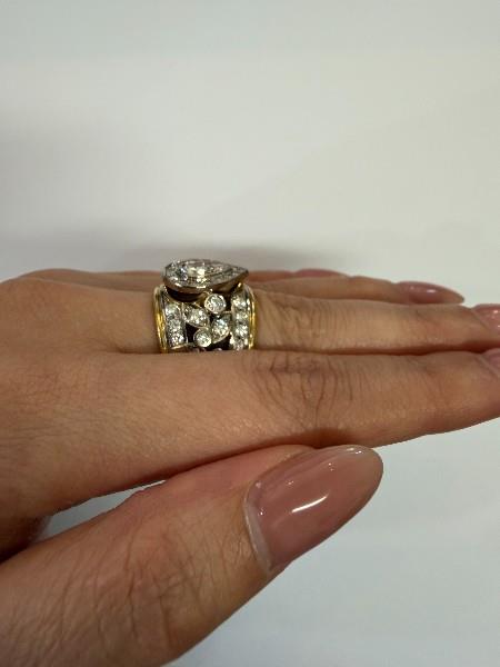 AN 18CT WHITE AND YELLOW GOLD PEAR SHAPE MULTI DIAMONDS PANEL RING SIZE M1/2, 18.5GR