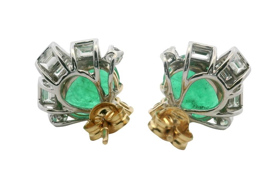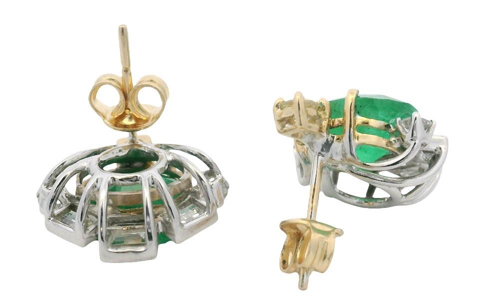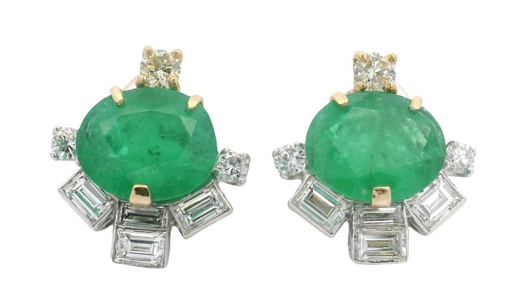 18ct white and yellow gold, featuring oval cut emeralds, totalling 6.10ct, horizontally set, medium green colour, in claws, accompanied by two round brilliant cut Diamonds on top, totalling 0.36ct, light champagne colour, partially surrounded by eight baguette cut Diamonds, side set, heavier set to the base, accompanied by four smaller round brilliant cut Diamonds, totalling 1.15ct, claws and partial bezel set, fitted to pierced post with backs. Height of studs: 1.5cm. Valuation on request. Total Weight: 5.9g