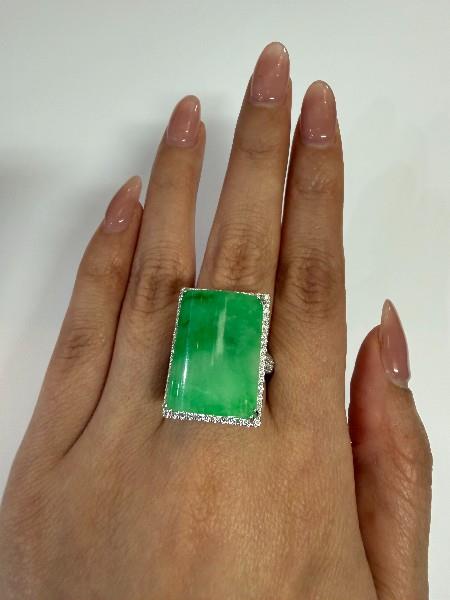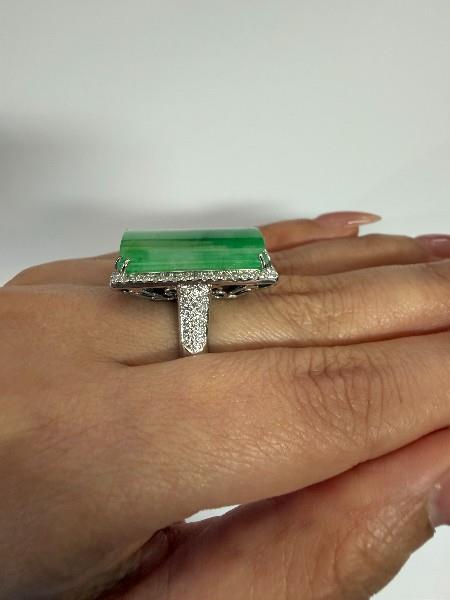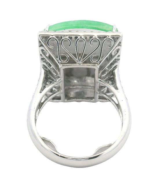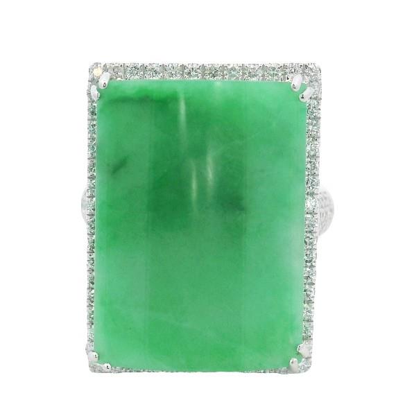 Stamped 18ct, but tested as 16ct white gold, featuring a rectangular polished Jade, measuring 16.5 x 22.5mm, convex underside, double claw set, surrounded by a cluster of round brilliant cut Diamonds, extending to the wide shoulders, in claws, decorative scroll underbasket, merging into a rounded band. Ring size: M1/2. Total Weight: 13.9g