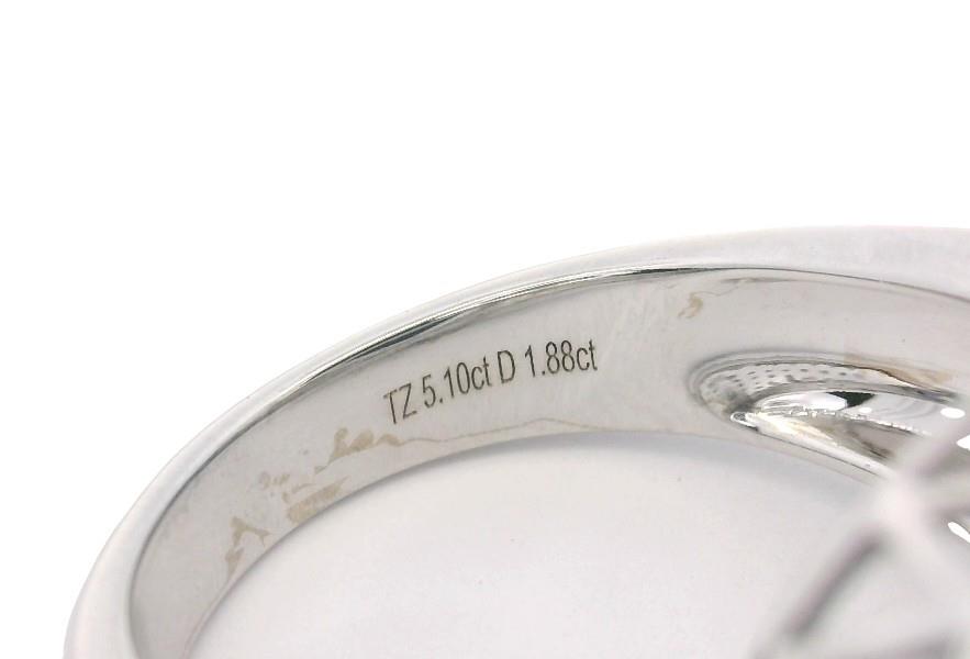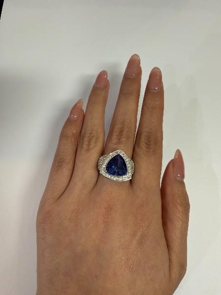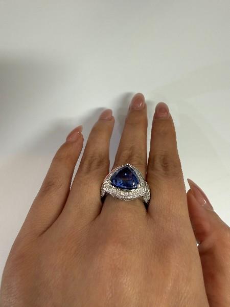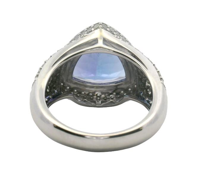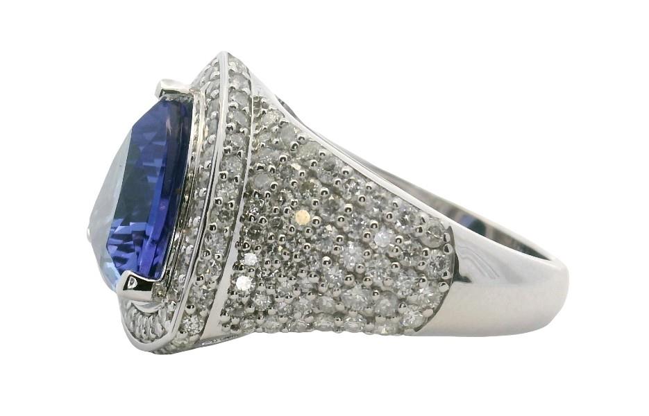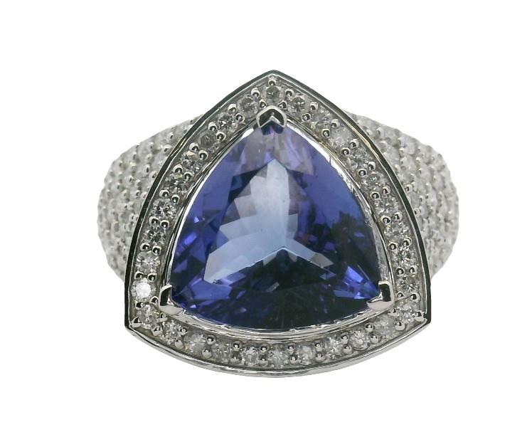 14ct white gold, featuring a trilliant mixed cut Tanzanite of 5.10ct, deep purple tone, three claw set, surrounded by a cluster of round brilliant cut Diamonds, shared bead set, extending to the dome shoulders, totalling 1.88ct, pave set, merging to a polished rounded band. Ring size: N1/2. Valuation on request. Total Weight: 9.1g