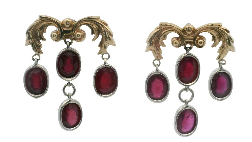 9ct yellow gold and Sterling Silver designed by Metal Couture Melbourne, styled as Gothic panel earrings, featuring a yellow gold scrolled rail of gold in plumed design, suspending three ruby set droplets, each oval and intense red in colour, bezel set in silver, articulated, the central of two the sides one each, completed with pierced posts.