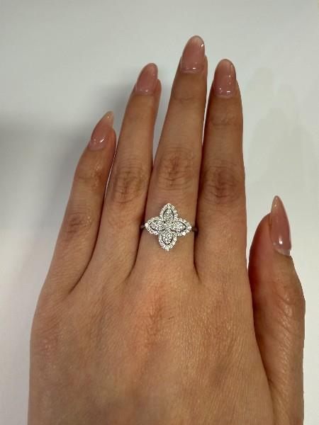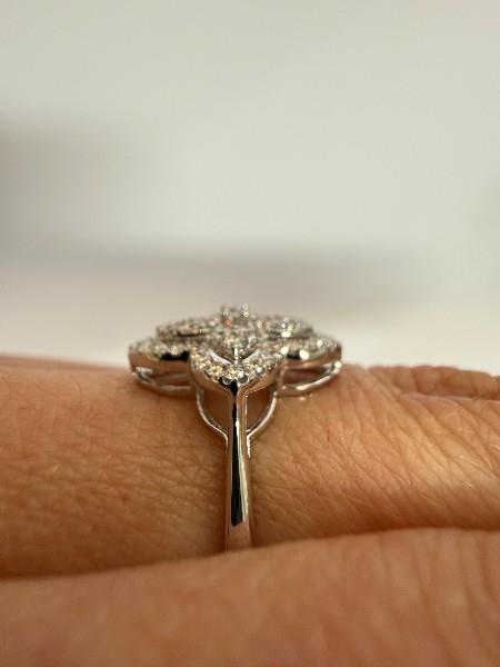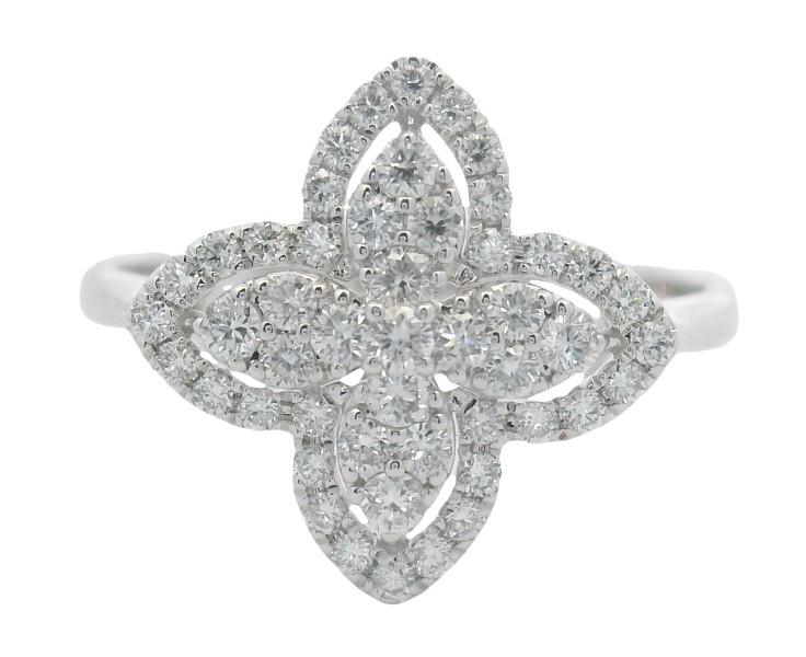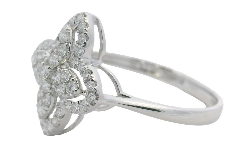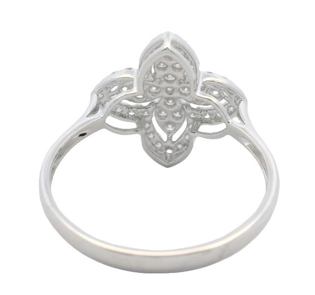 18ct white gold, featuring multi round brilliant cut Diamonds, totalling 0.445ct, in claws, detailed to a four marquise shape petal flower and lined to a floating outline border, frame outline, visible to the side mount, pinched shoulders, merging into a half round band. Ring size: N. Total Weight: 2.2g