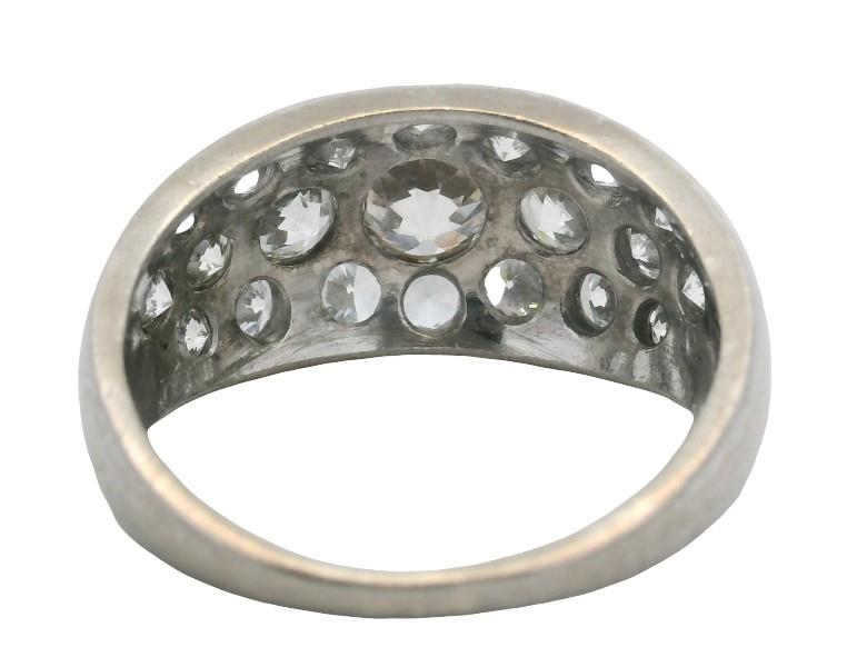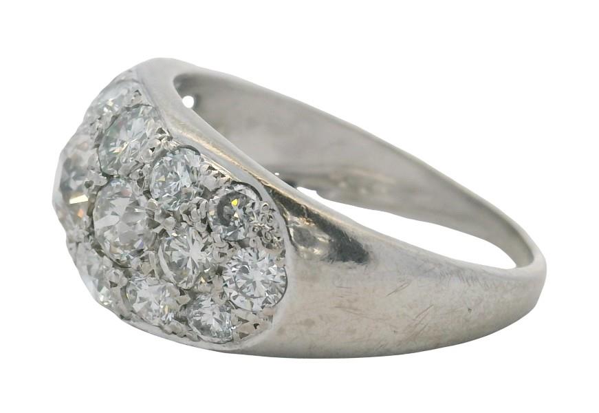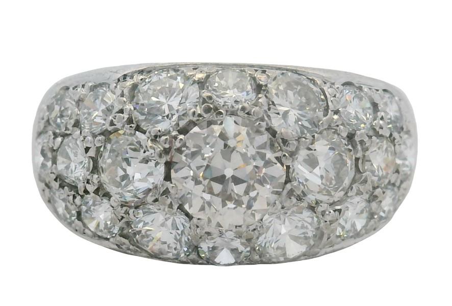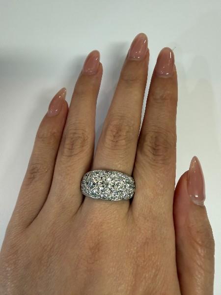 18ct white gold, handcrafted as a low domed pave set panel ring of tapering form, featuring a combination of old and brilliant cut diamonds throughout, the largest to centre, an old cut of approximately 1.00ct, graduating to the smallest of approximately 0.10ct, totalling approximately 3.70ct, edged in closed rails, tapering to reverse. N.B. one stone chipped.