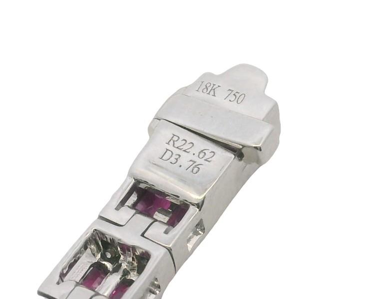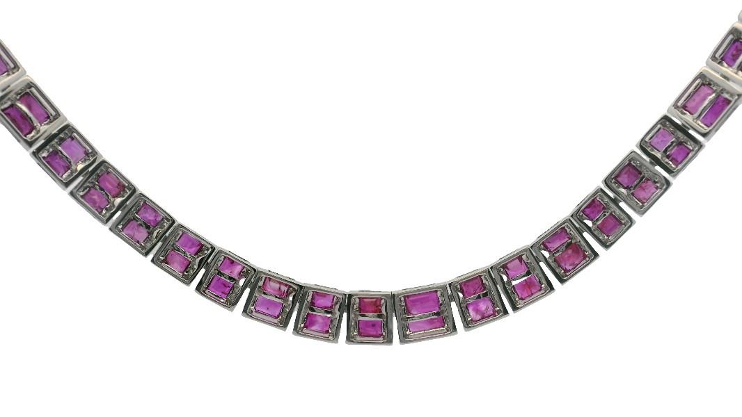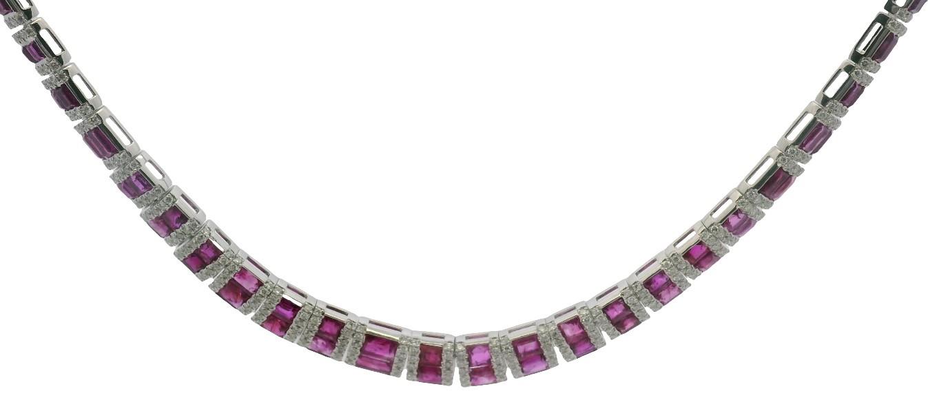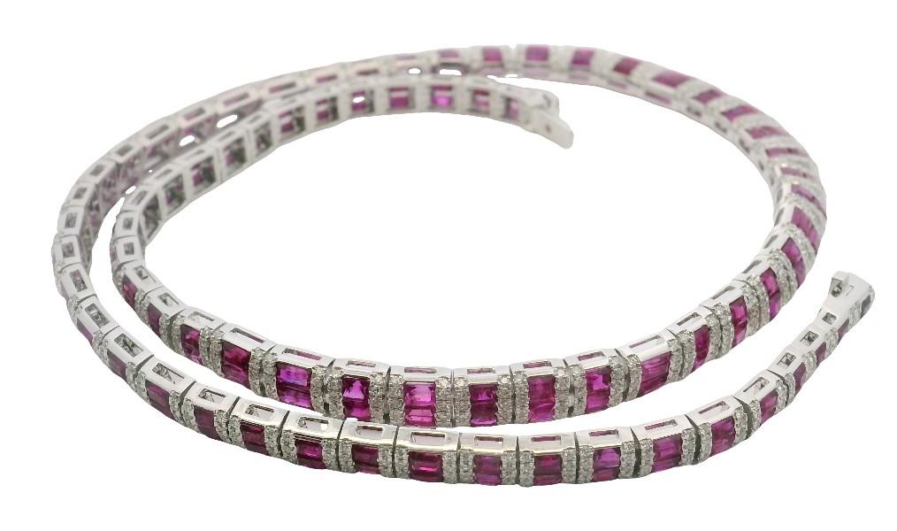 18ct white gold, featuring horizontally stacked pink Tourmalines of graduating sizes towards the front, totalling 22.62ct, deep pink colour, tension set, lined to both sides by round brilliant cut Diamonds, totalling 3.76ct, claw set, linked together in a semi flexible collier, measuring 42cm in length, complete with a concealed box clasp, secure with underside latch. Total Weight: 38.9grams