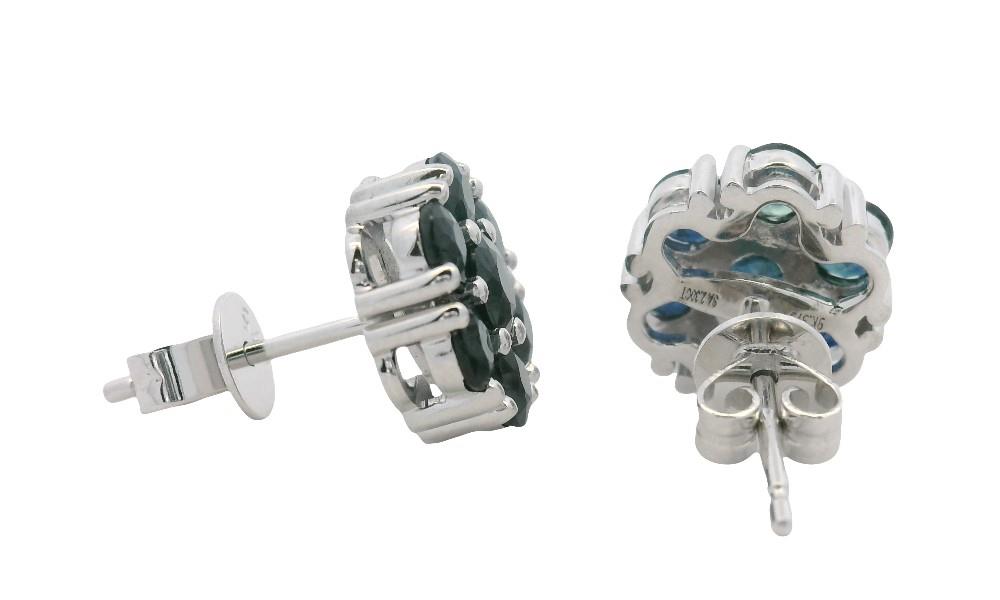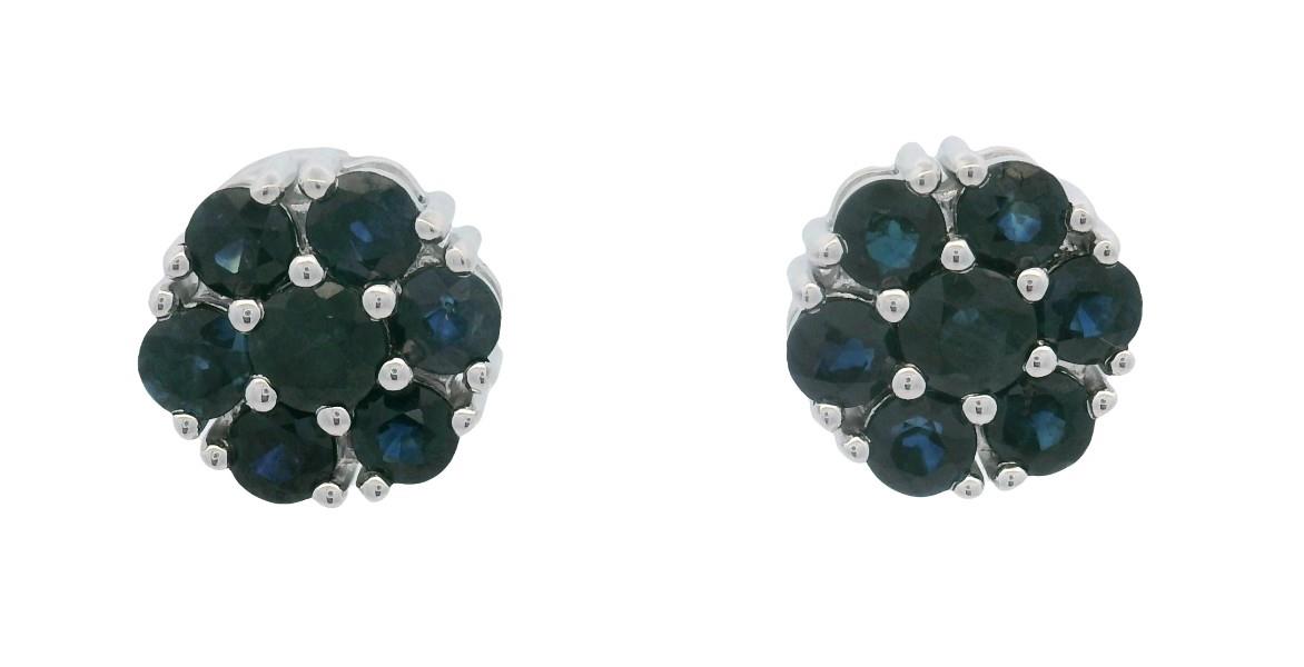 9ct white gold, featuring twelve round cut Sapphires, in floral clusters of six, surrounding a larger round cut Sapphire, totalling fourteen all together with a combined weight of 2.30ct, dark grey/blue hue, multiple bead set, complete edges, pierced post with backings. Height of studs: 10mm. Valuation on request. Total Weight: 2.4g