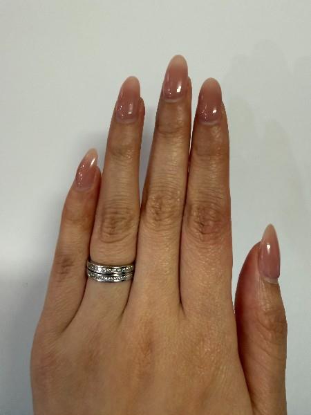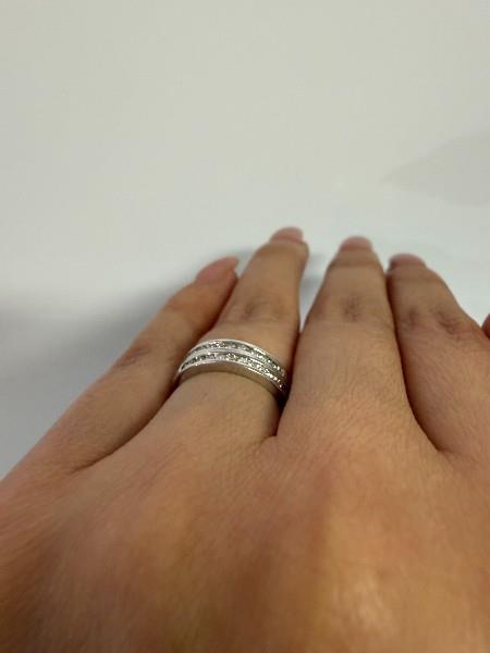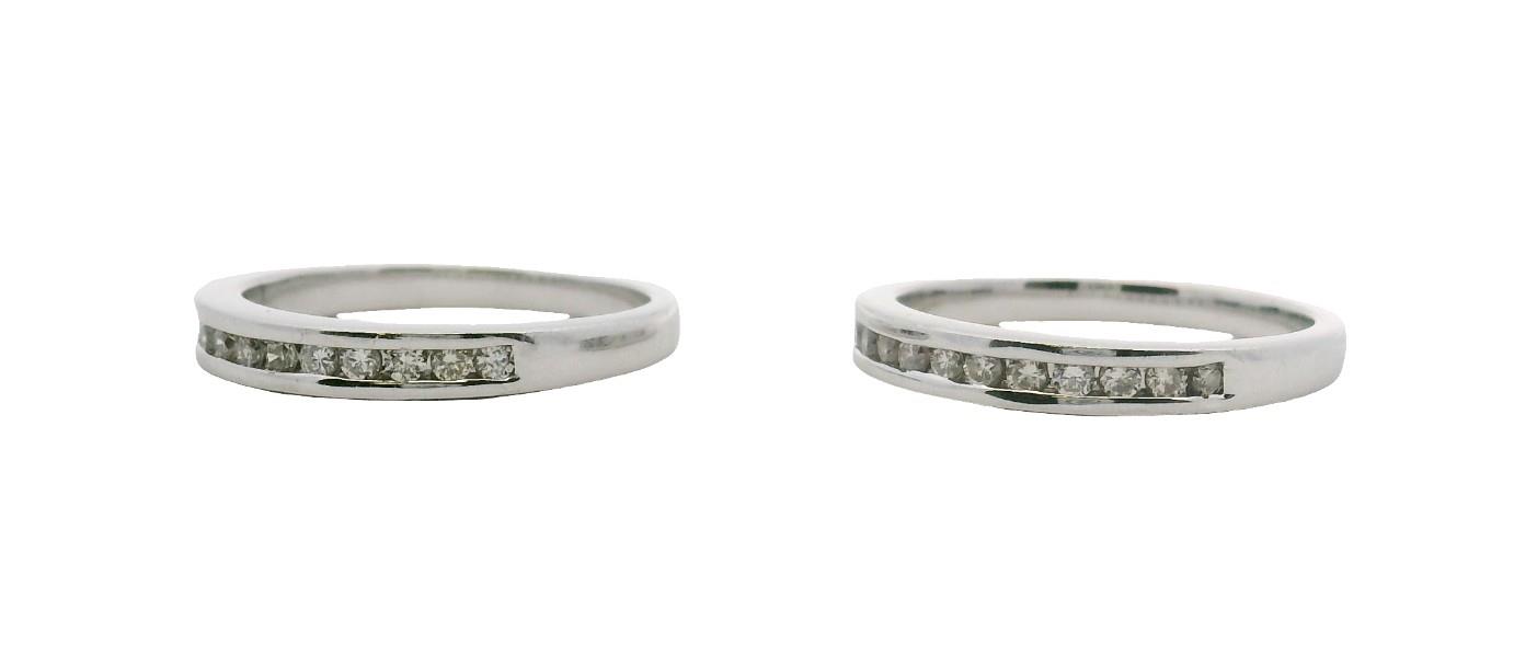 18ct white gold, each measuring 2.5mm, channel set across each with twelve small brilliant cut diamonds, totalling approximately 0.12ct, merging to fine simple bands. A.T.D.W.: 0.24ct. Ring Size I. Total Weight: 4.3grams