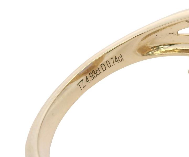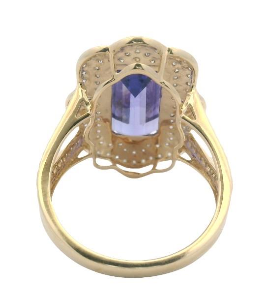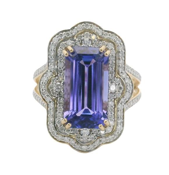 14ct yellow gold, featuring a rectangular emerald cut Tanzanite of 4.93ct, deep purple colour, double claw set, surrounded by a double half scallop frame, detailed by round brilliant cut Diamonds, extending to the wide split shoulders, totalling 0.74ct, merging into a square edge band. Ring size: O. Valuation on request. Total Weight: 5.1g