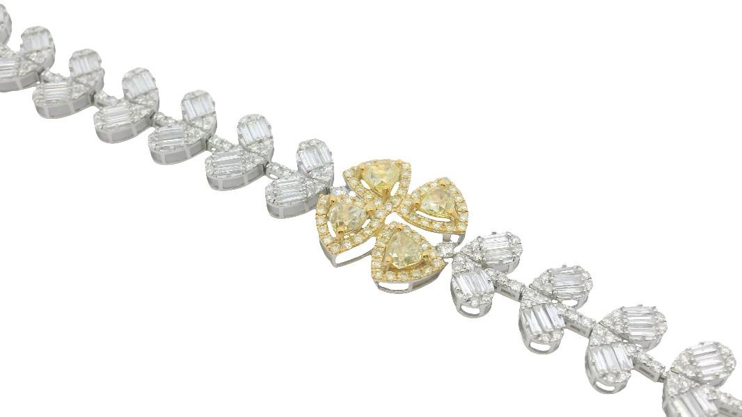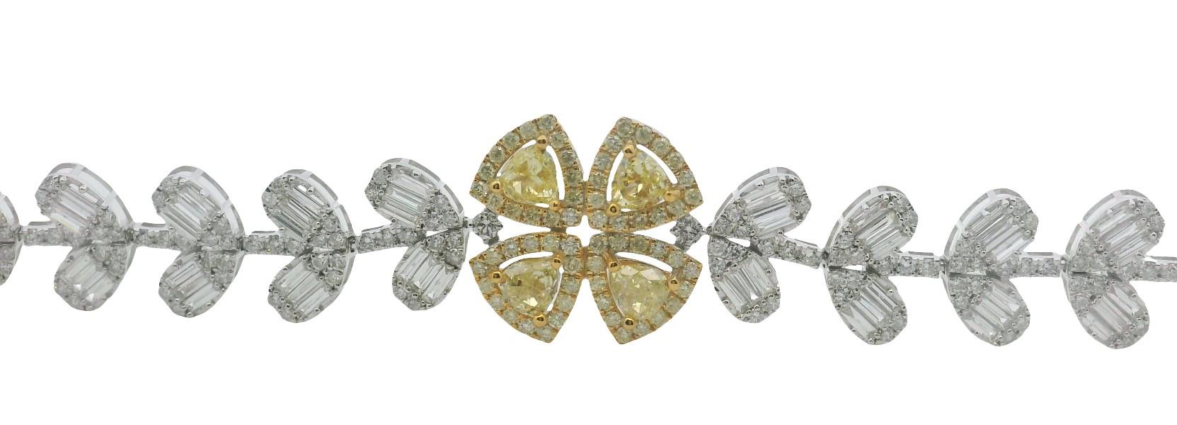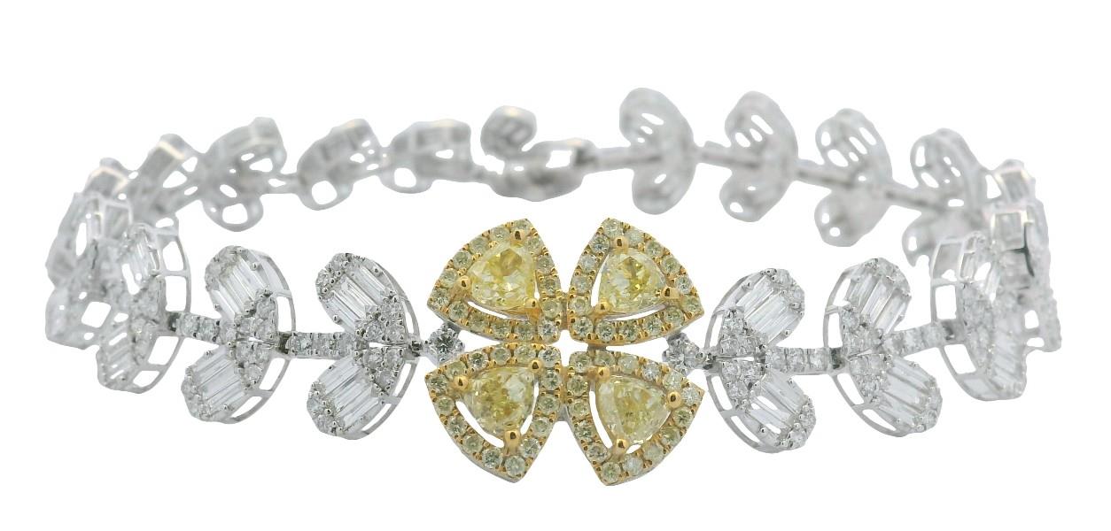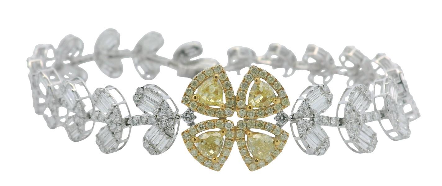 18ct yellow & white gold, featuring a cluster of four trillion cut yellow Diamonds, surrounded by a halo of smaller round briliant cut yellow Diamonds, totalling 1.44ct, arranged in a shape of a four leaf clover, linked through into a flexible bracelet by lined round brilliant cut Diamonds, alternating between outward leaf design as links, made up of baguette cut Diamonds and round brilliant cut Diamonds, totalling 5.25ct, measuring 18.5cm in length, complete with concealed groove and tongue clasp, secure with an under latch. Total Weight: 12.8g