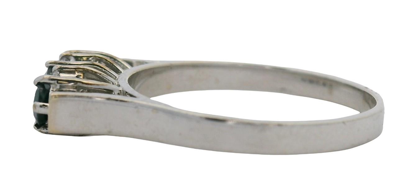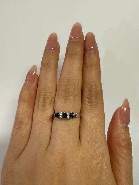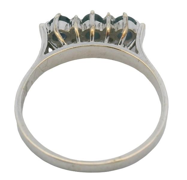 18ct white gold, Circa: 1970's, designed as a raised Height, straight panel ring set with three strong deep blue sapphires of uniform size, totalling approximately 0.45ct, each claw set, spaced by four smaller brilliant cut diamonds set in rails of two vertically, flanked by raised upswept shoulders and a fine band. Ring Size L.
