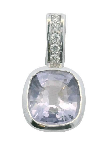 14ct white gold, stamped, featuring a simple fixed drop design, set with a light lavender coloured spinel of oval cushion shape, weighing approximately 1.50ct, bezel set in a smooth edge, surmounted by a small grain set diamond bail. Length: 1.8cms