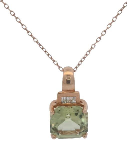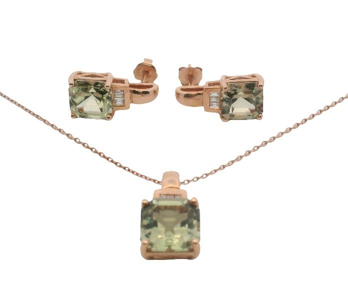 14ct rose gold, comprising fixed short drop studs, each set with two small diamonds and a square cut andalusite of golden amber green colour, claw set with pierced posts, along with a pendant of matched design and larger size suspended from fine trace link chain with clasp. Boxed and retailed through Effy New York.
