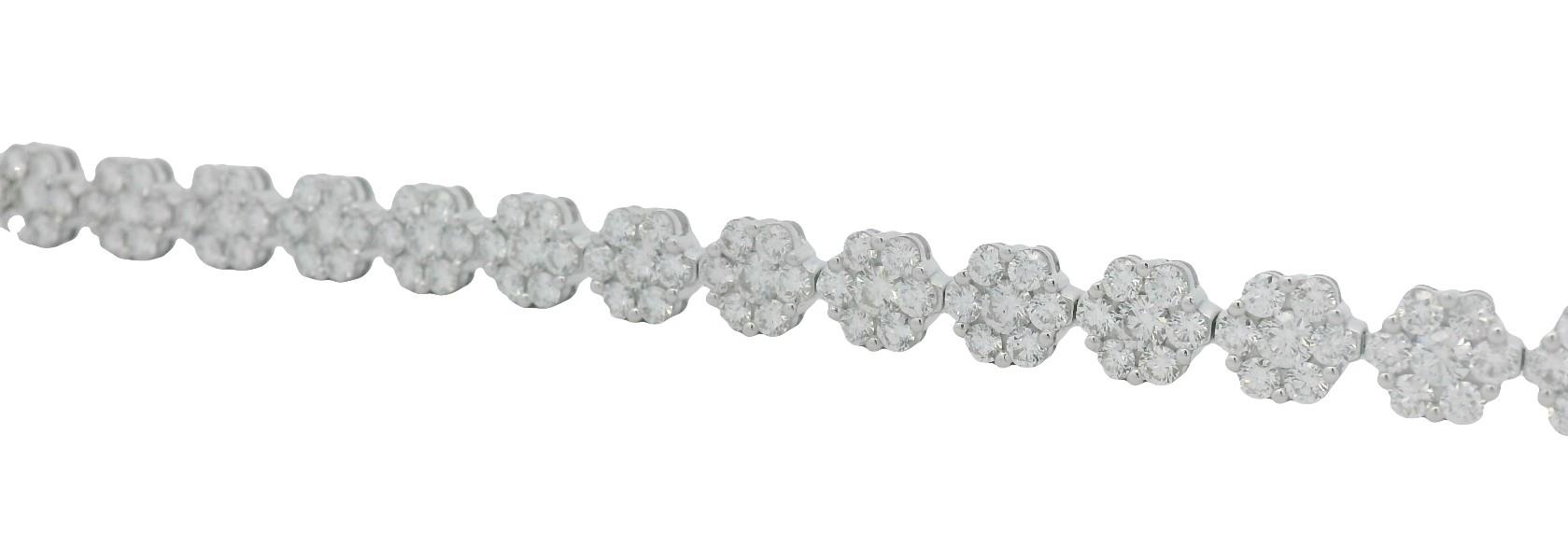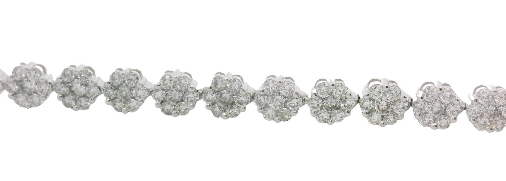 18ct white gold, featuring thirty-four round floral clusters of seven round brilliant cut Diamonds, totalling 3.38ct, centre of larger size, shared bead set, individual basket setting, double rail, linked through the middle in a semi flexible bracelet measuring 17cm long, complete with concealed groove and tongue clasp, secure with double side latches. Total Weight: 9.3g