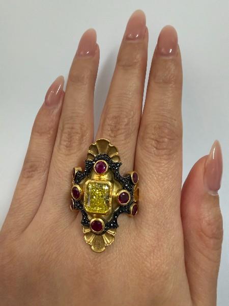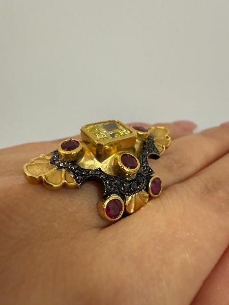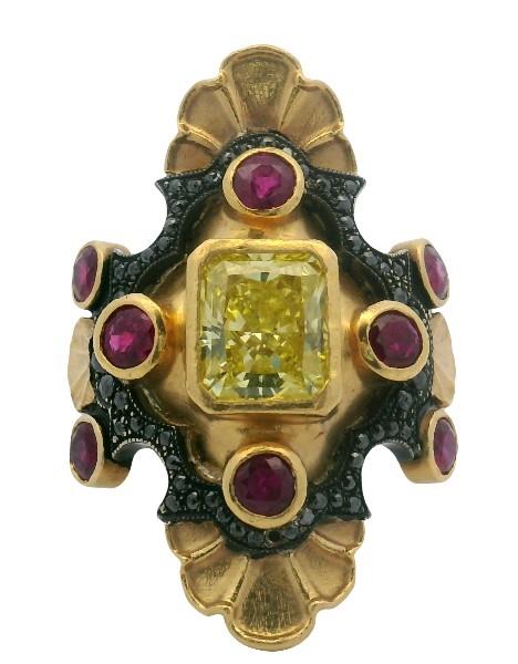 18ct yellow gold with black rhodium detail, handcrafted by Melbourne jeweller Metal Couture, in the style of the Medieval Collection, scalloped kite shape with curved form, measuring 35mm in length, centrally set with a radiant golden diamond of intense colour, weighing approximately 2.75ct, bezel set, framed by four bezel set round rubies of strong colour, an outer pave black diamond set frame and further rubies to shoulders, brushed and polished gold textures enhance panel. Central diamond colour enhanced.