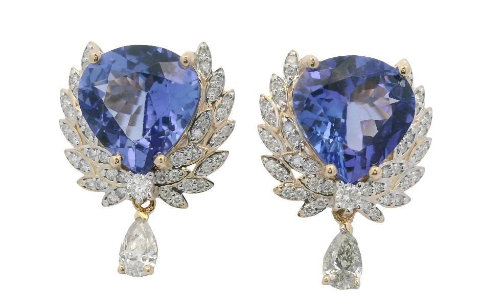 14ct yellow gold, featuring two pear mixed cut Tanzanites, totalling 6.89ct, medium to deep purple tones, in claws, enclosed in between two Diamond detailed wings, made up of eight-two round brilliant cut Diamonds, totalling 0.35ct, claw set, suspending an additional pear cut Diamond dangle, totalling 0.37ct, in claws, fitted to pierced post, hinged click closure. Height of earrings: 2cm. Valuation on request. Total Weight: 5.3g