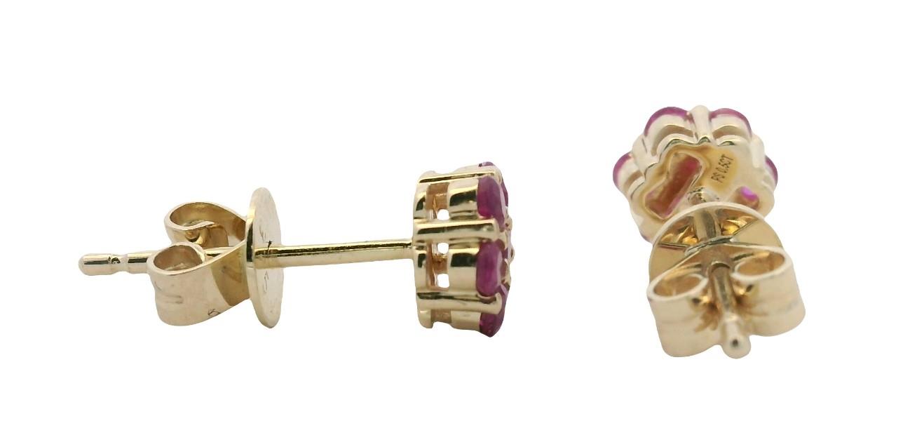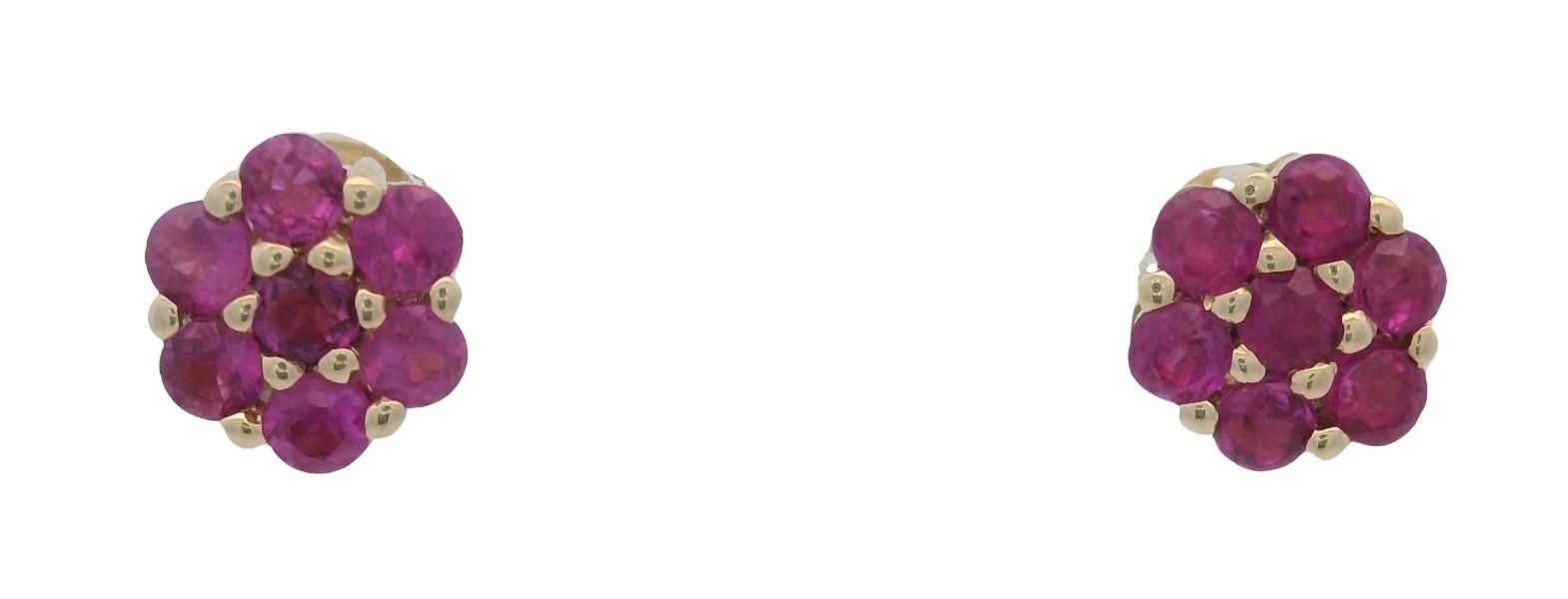 9ct yellow gold, featuring fourteen small round cut pink Sapphires, in floral clusters of seven, medium pink tones, bead set, scallop edges, pierced post with backings. Height of studs: 5mm. Valuation on request. Total Weight: 1.1g