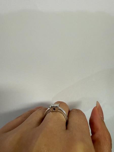 18ct white gold, stamped to inner band, ring of low profile, featuring nine princess cut Diamonds, totalling approximately 0.54ct, tension set in basket with corner outer claw set, pierced kite shape openings to sides, open back, flanked by twelve princess cut Diamonds, detailed to top of the shoulders, totalling approximately 0.30ct, channel set, merging into a square edge band with semi rounded profile. Ring size: L1/2. Total Weight: 4.3g