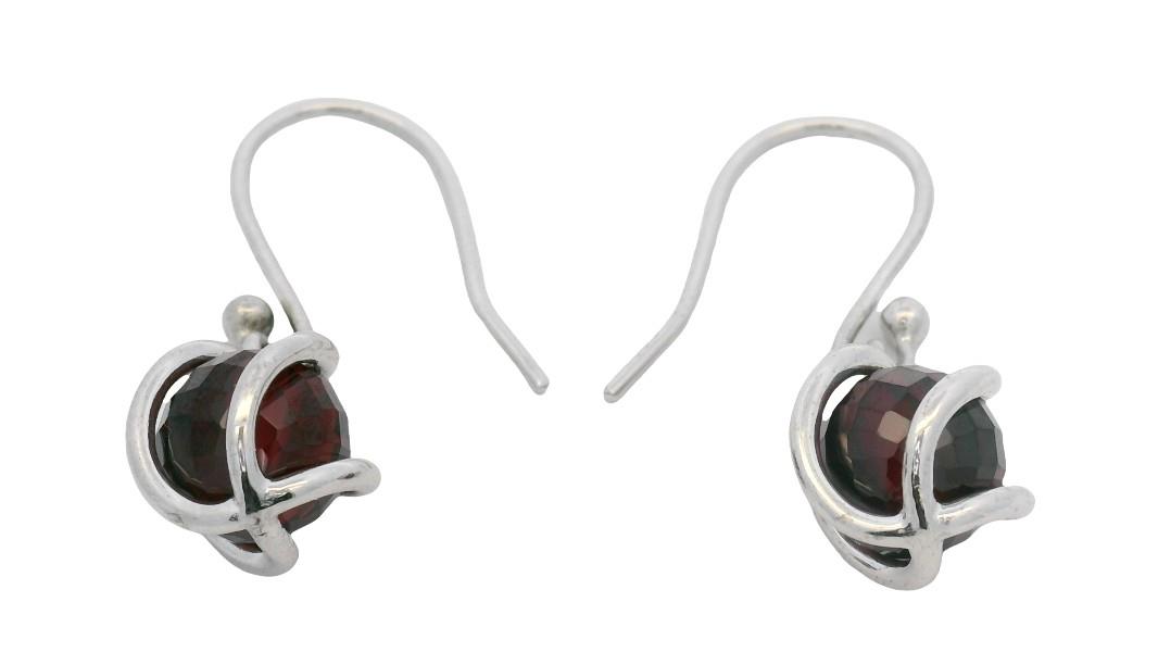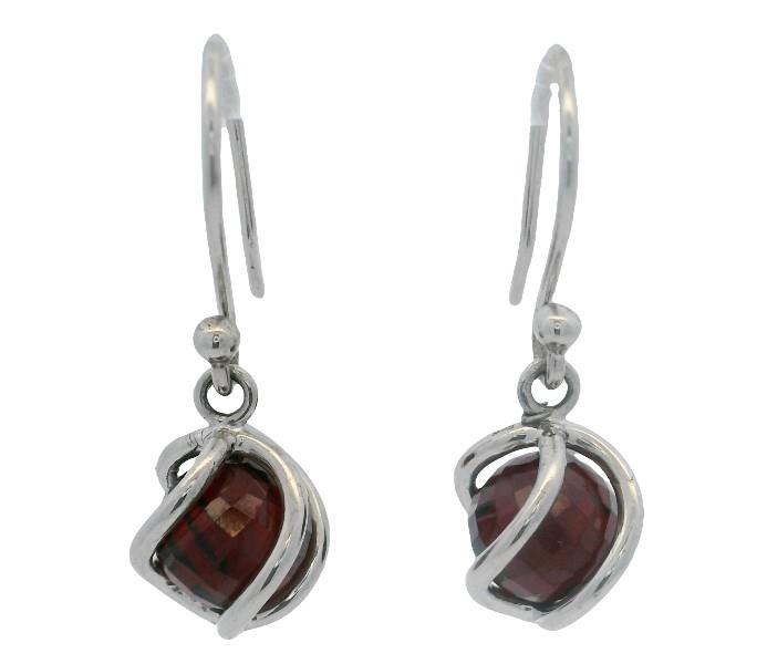 9ct white gold, featuring two checkerboard cut Garnets, in rounded bead form, medium to deep red tones, drilled and mounted in a curve bar cage, articulated from pierced hooks. Height of earrings: 3cm. Total Weight: 5.1g
