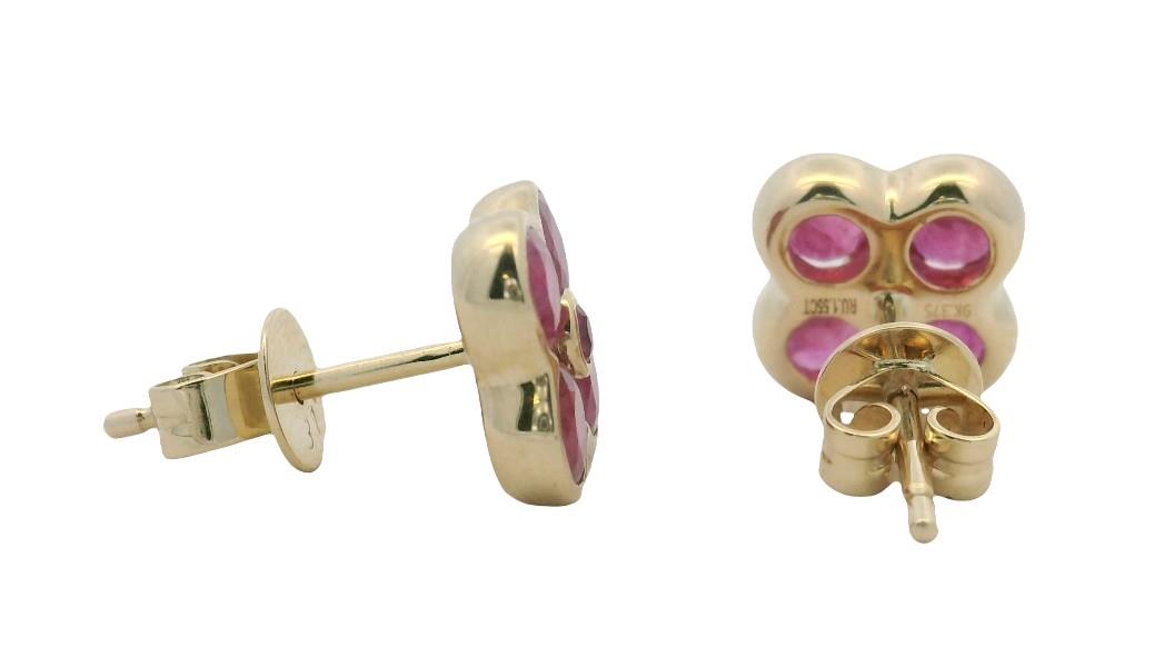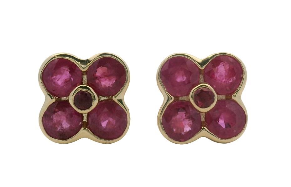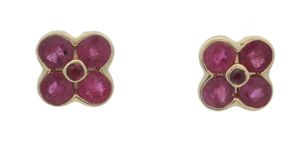 9ct yellow gold, featuring eight small round cut Rubies in clusters of four, surrounding a smaller round cut Ruby, totalling ten all together with a combined weight of 1.55ct, medium pink tones, semi bezel and bezel set, pierced post with backings. Height of studs: 8mm. Valuation on request. Total Weight: 1.9g