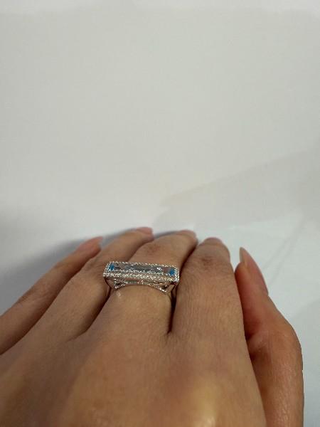 AN ELONGATED EMERALD CUT AQUAMARINE 1.36CT BAR RING IN 18CT GOLD, SIZE N, 2.8GRAMS