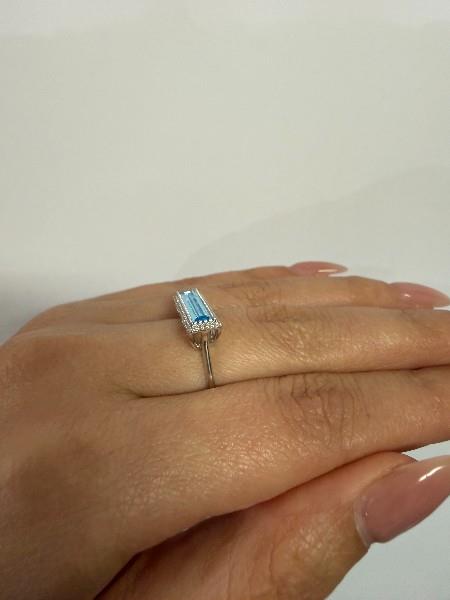 18ct white gold, featuring an elongated emerald cut Aquamarine, totalling 1.36ct, multiple micro claw setting, side set as a bar, surrounded by round brilliant cut Diamonds, totalling 0.080ct, claw set to mount, upswept shoulders, merging into a half round band. Ring size: N. Total weight: 2.8g