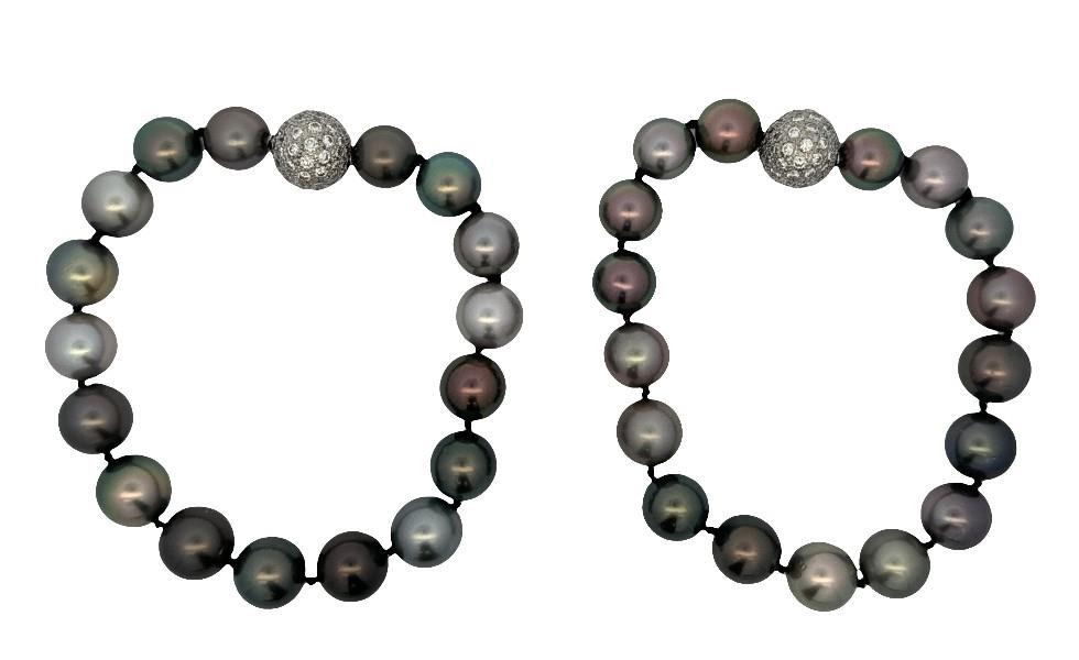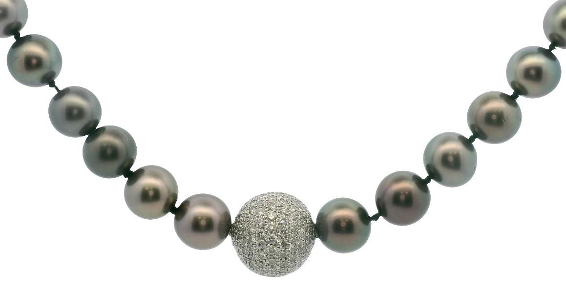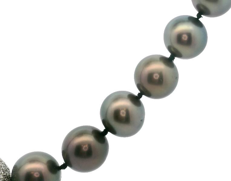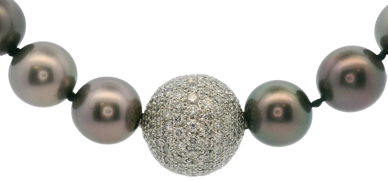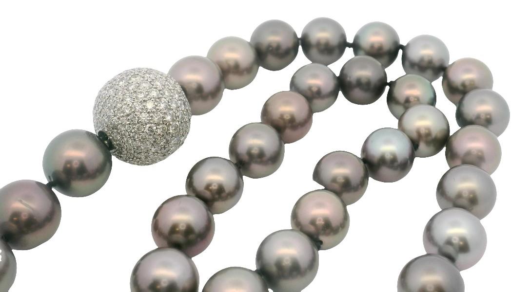 18ct white gold ball clasp/feature drop, presented as two hundred and seventy round brilliant cut Diamonds, totalling 7.00ct, pave set, featuring thirty-six near round Tahitian Pearls, light to medium body colour with rose and purple overtones, good lustre, double knotted throughout, each Pearl measuring from 11.0 to 12.9mm and 49cm in total length, push twist and release clasp with three entry points. Can be worn in two different ways. Valuation on request. Total Weight: 90.7gr
