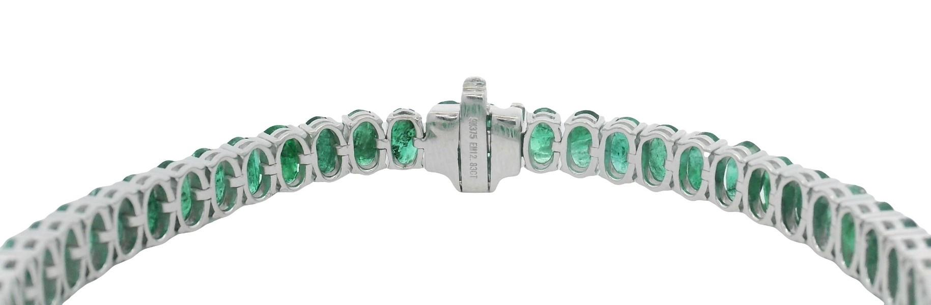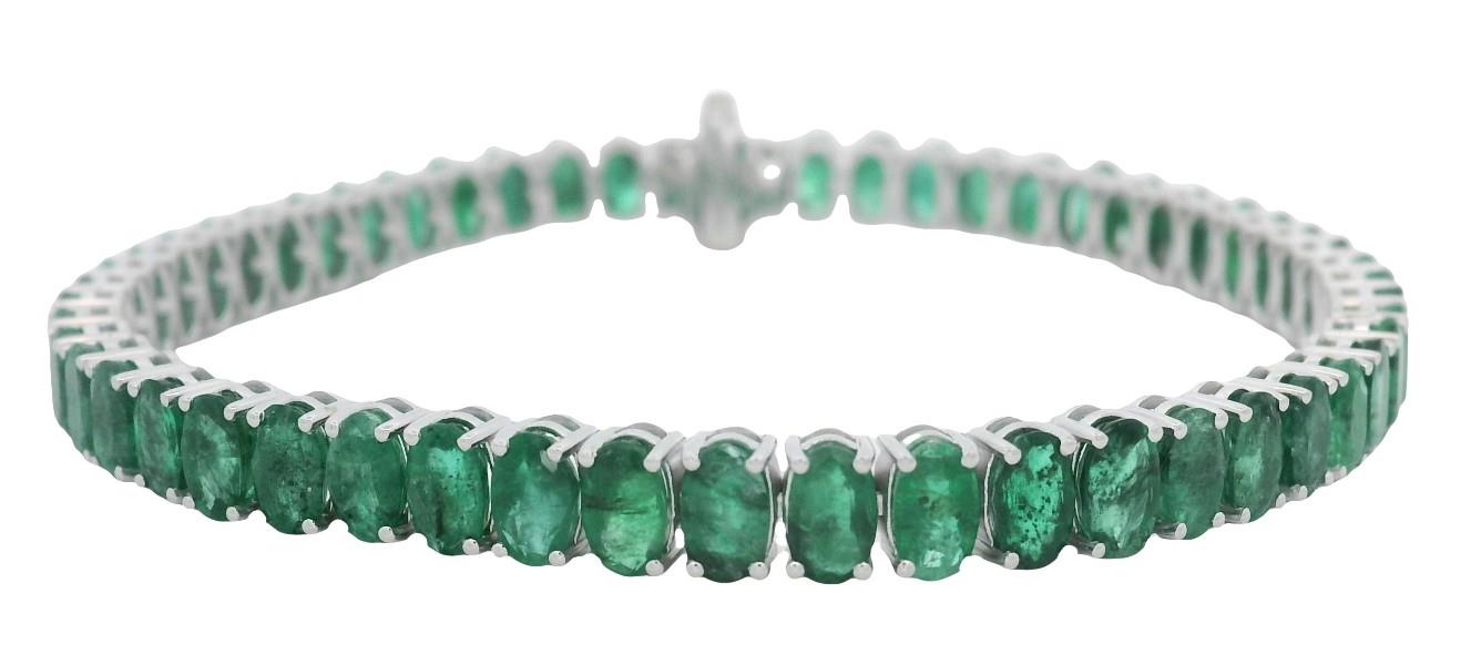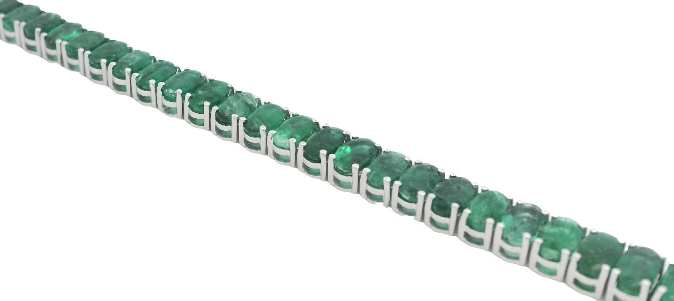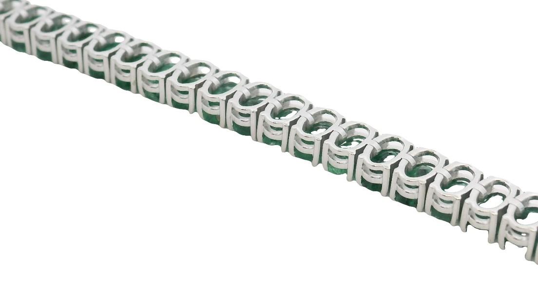 9ct white gold, featuring fifty-four oval cut Emeralds, totalling 12.83ct, medium to deep green, horizontally lined, basket set, linked through the middle in a semi flexible bracelet, measuring 18cm in length, complete with concealed groove and tongue clasp, secure with under latch. Valuation on request. Total Weight: 11.3gr