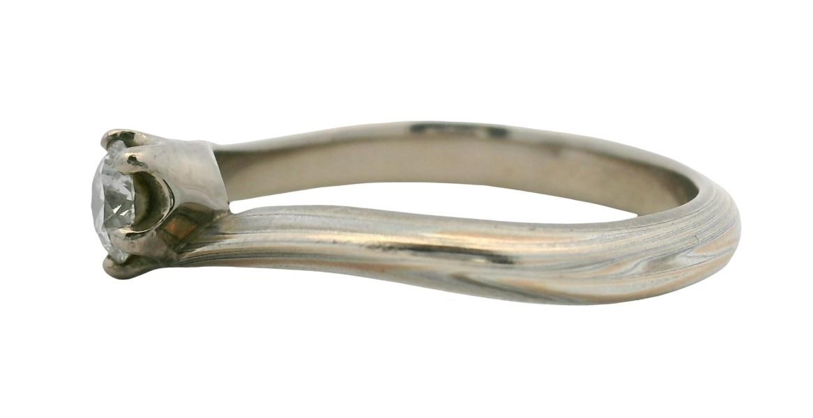 An 18ct gold and silver mixed metals ring crafted in the technique of Mokume Gane ("wood grain metal") handcrafted in Japan, featuring a single brilliant cut certified diamond of 0.29ct, claw set in five bead claws, set to a twisted band of textured finish. Boxed with receipt and certificates.