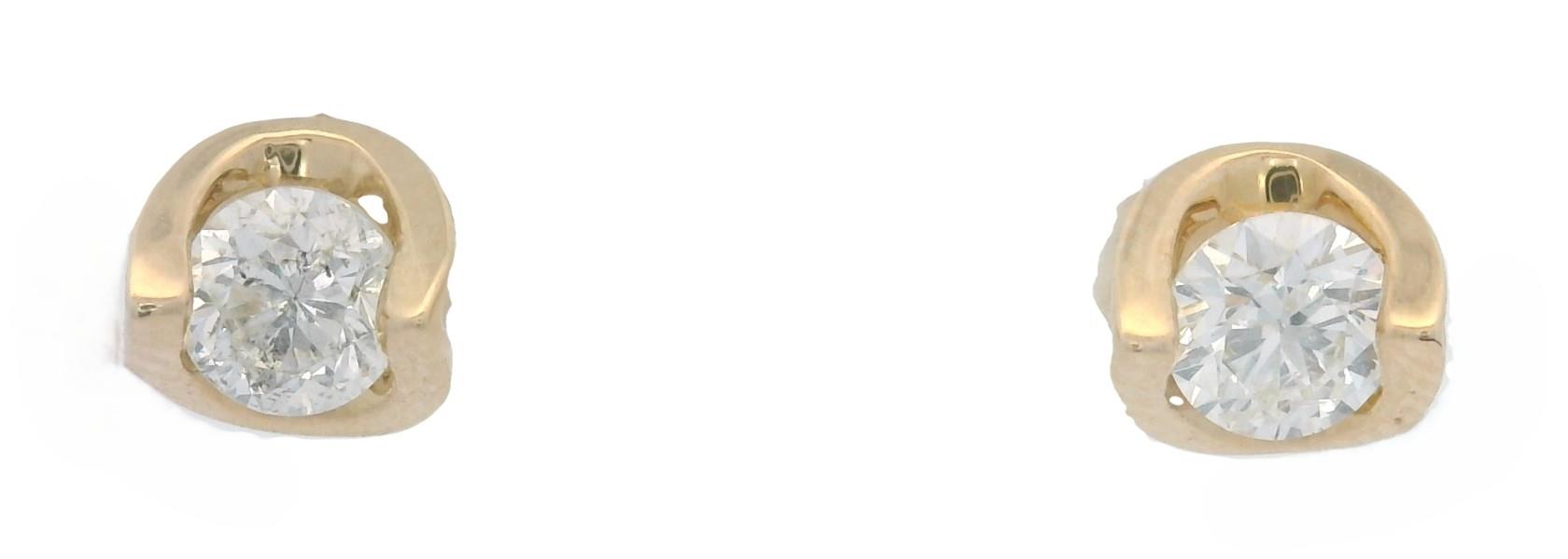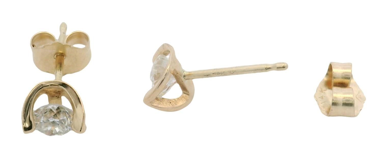 14ct yellow gold, featuring two round brilliant cut Diamonds, totalling 0.50ct, tension set, polished scallop shape mount, pierced post with butterfly backs and additional rubber caps. Diameter of studs: 3.5mm. Valuation on request. Total Weight: 0.8g