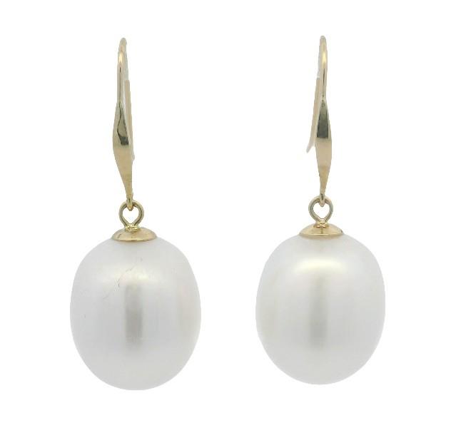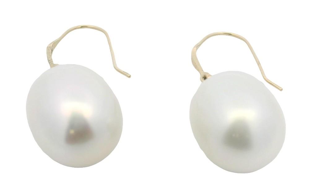 9ct yellow gold, featuring two oval shape South Sea Pearls, measuring approximately 14.5 x 11.7mm, silvery body colour with faint blush overtones, fine lustre, half drilled and capped, articulated from shapely pierced hooks. Height of earrings: 3.1cm. Total weight: 6.2gr