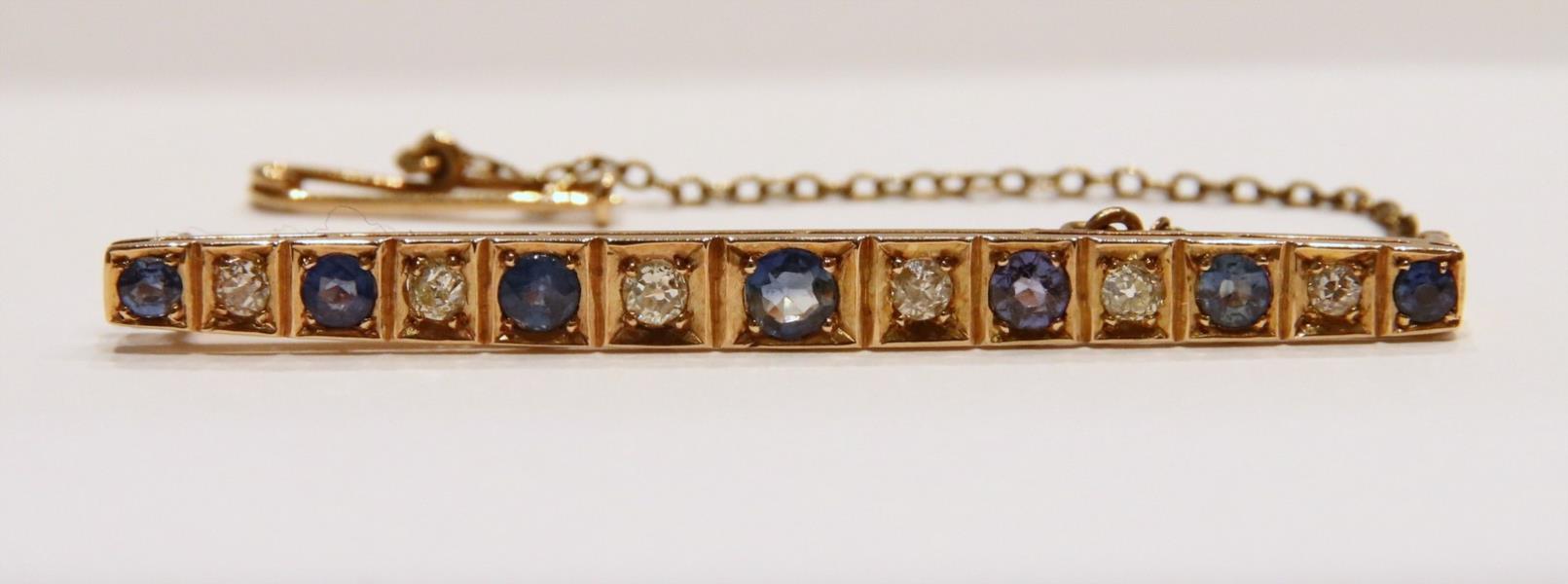 14ct rose gold, made as a straight bar of rectangular form, measuring 5.5cm, alternating with six old cut diamonds and seven round sapphires, graduating in size, bead claw set within square edged frames, completed with pin.