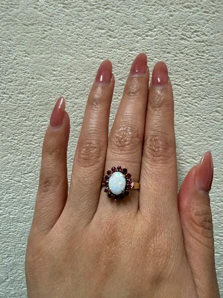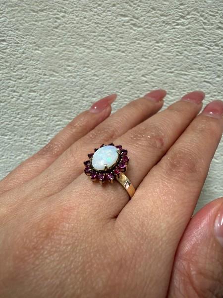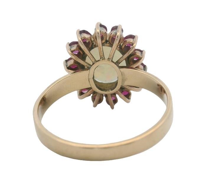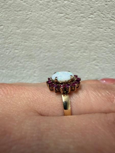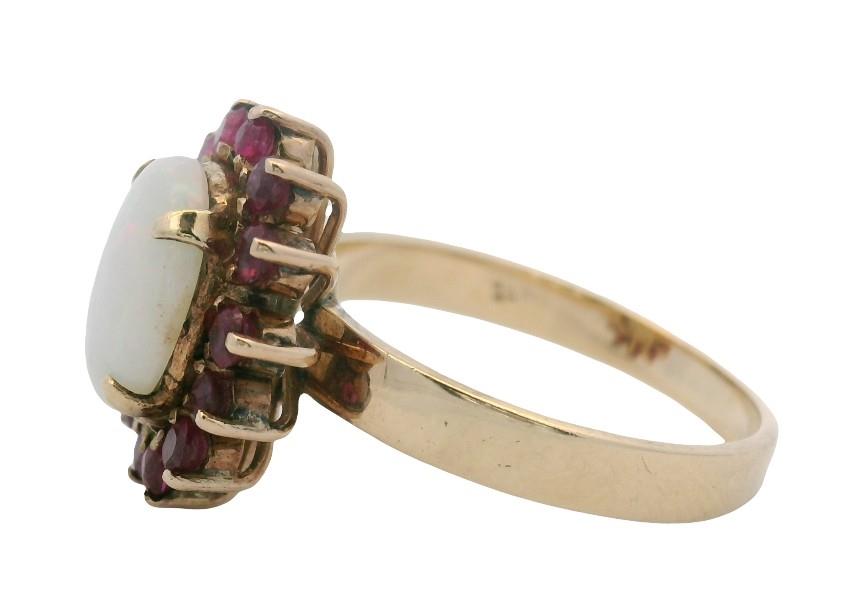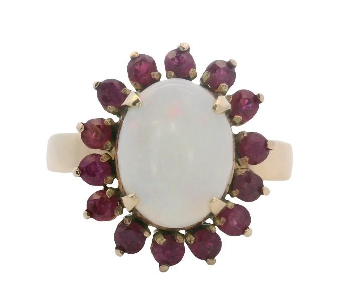 9ct yellow gold, featuring a White Opal oval cabochon of approximate (7 x 9mm) dimensions, white body with play of colours of red, green, blue, purple and yellow, in claws, surrounded by a cluster of round cut Rubies, totalling fourteen altogether with a combined Weight of approximately 0.42ct, claw and outer claw set, extending to underbasket, merging into a flat band. Ring size: M. Total Weight: 2.9gr